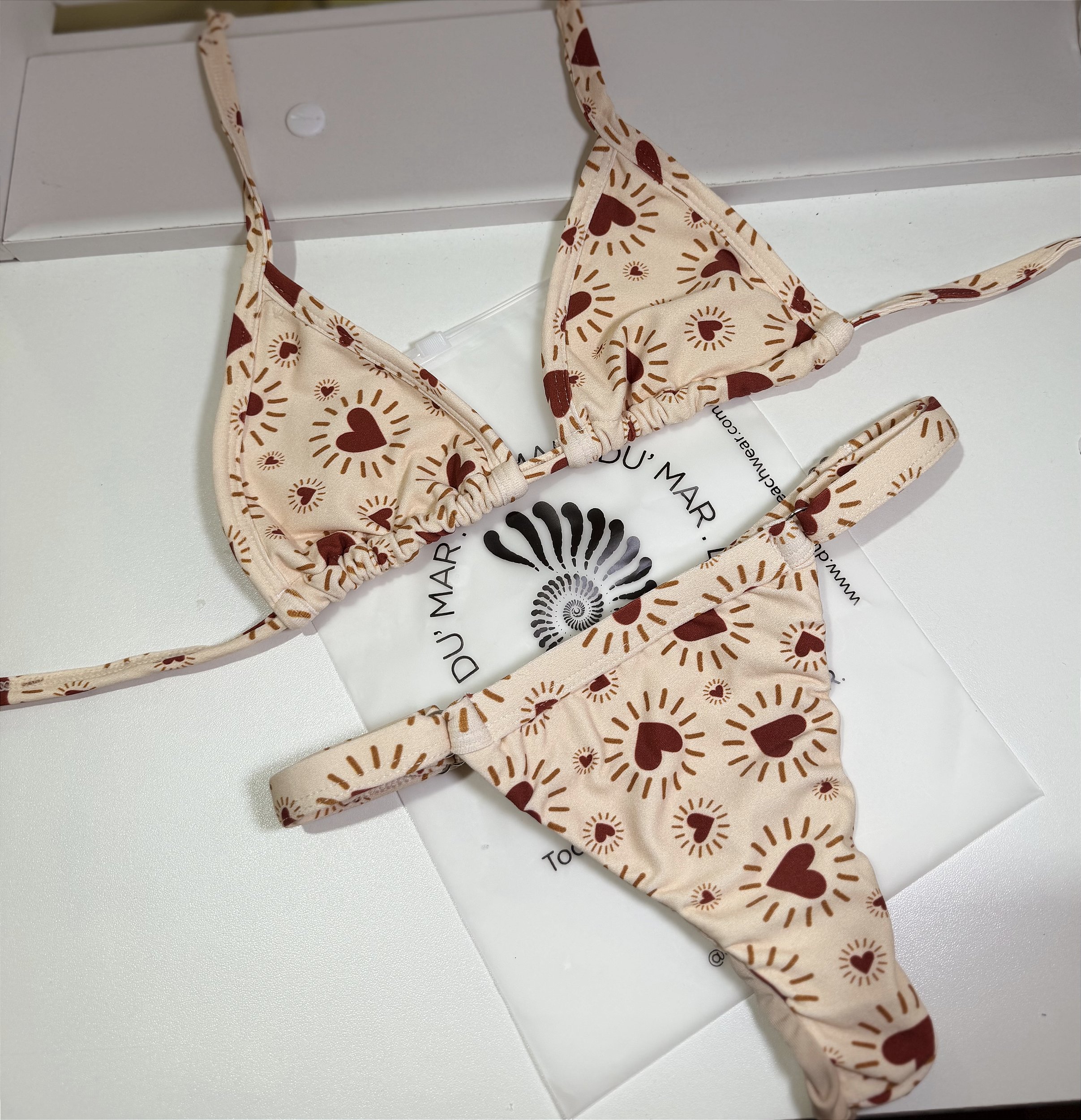 Delicado e cheio de personalidade, este biquíni cortininha traz uma estampa exclusiva de corações com detalhes radiantes, perfeito para quem ama um visual romântico com um toque moderno.