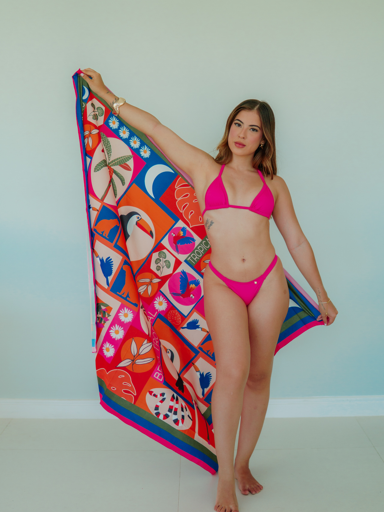 Com tucanos, luas, flores e folhagens em um mix de cores vibrantes, o Selva Encantada é uma explosão de arte e brasilidade. Inspirado na estética tropicalista, combina modernidade e natureza em uma estampa ousada e irresistível.